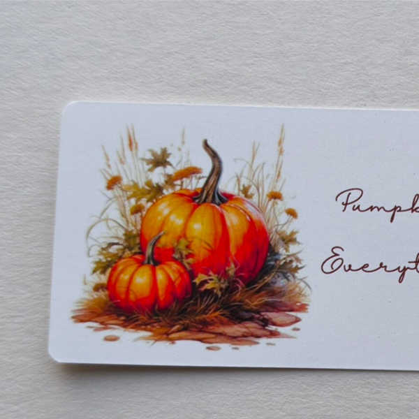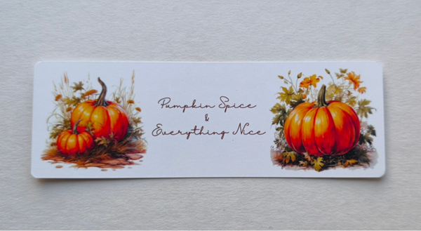 Featuring beautiful pumpkins and text "Pumpkin Spice and Everything Nice", these bookmarks perfectly capture the essence of autumn. Made from premium 350gsm white semi-glossy satin coated paper, they offer the ideal blend of sturdiness and slimness, ensuring a smooth fit in your favorite books.
