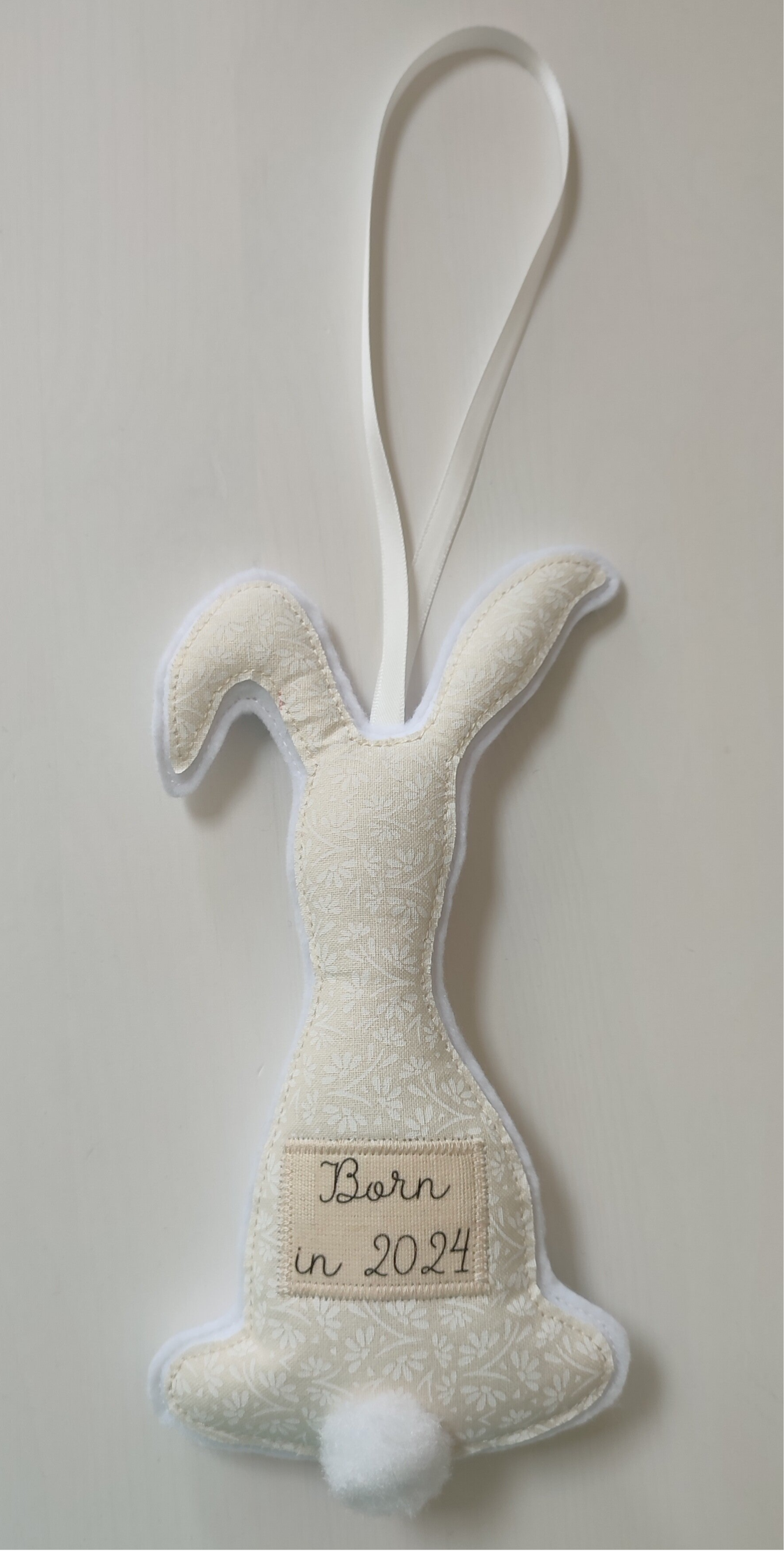 Handcrafted with love, each bunny features colourful cotton fabric, a felt back, ribbon, and a cute pom-pom tail. Personalisation is stitched on the front, while the back is finished in white or ivory felt. Designed to hang on walls, doors, or hooks, it adds a charming touch of springtime whimsy to any room.