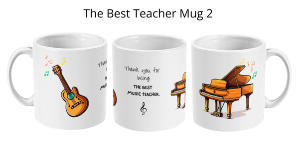 Each mug features a beautiful musical instrument design—choose from piano, violin, or other music-themed styles—and personalise it with your own message or the teacher’s name.