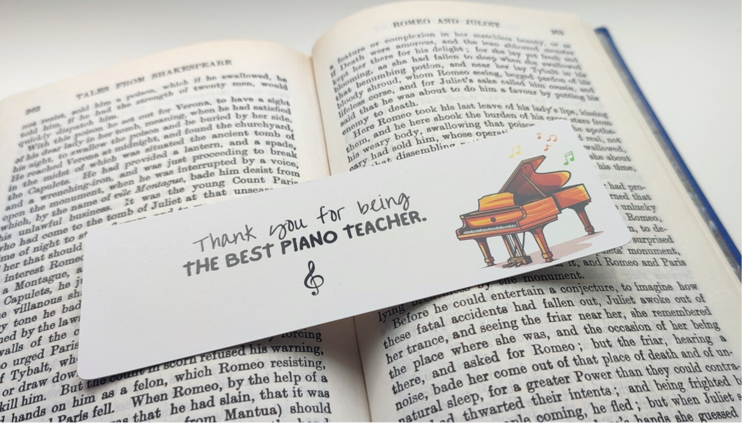 "Thank You for Being the Best Piano Teacher" bookmarks feature piano image, paired with a heartfelt appreciation message. This design comes as shown—no tassel and not customisable. For personalised options or limited versions with tassels, please see our other listings.