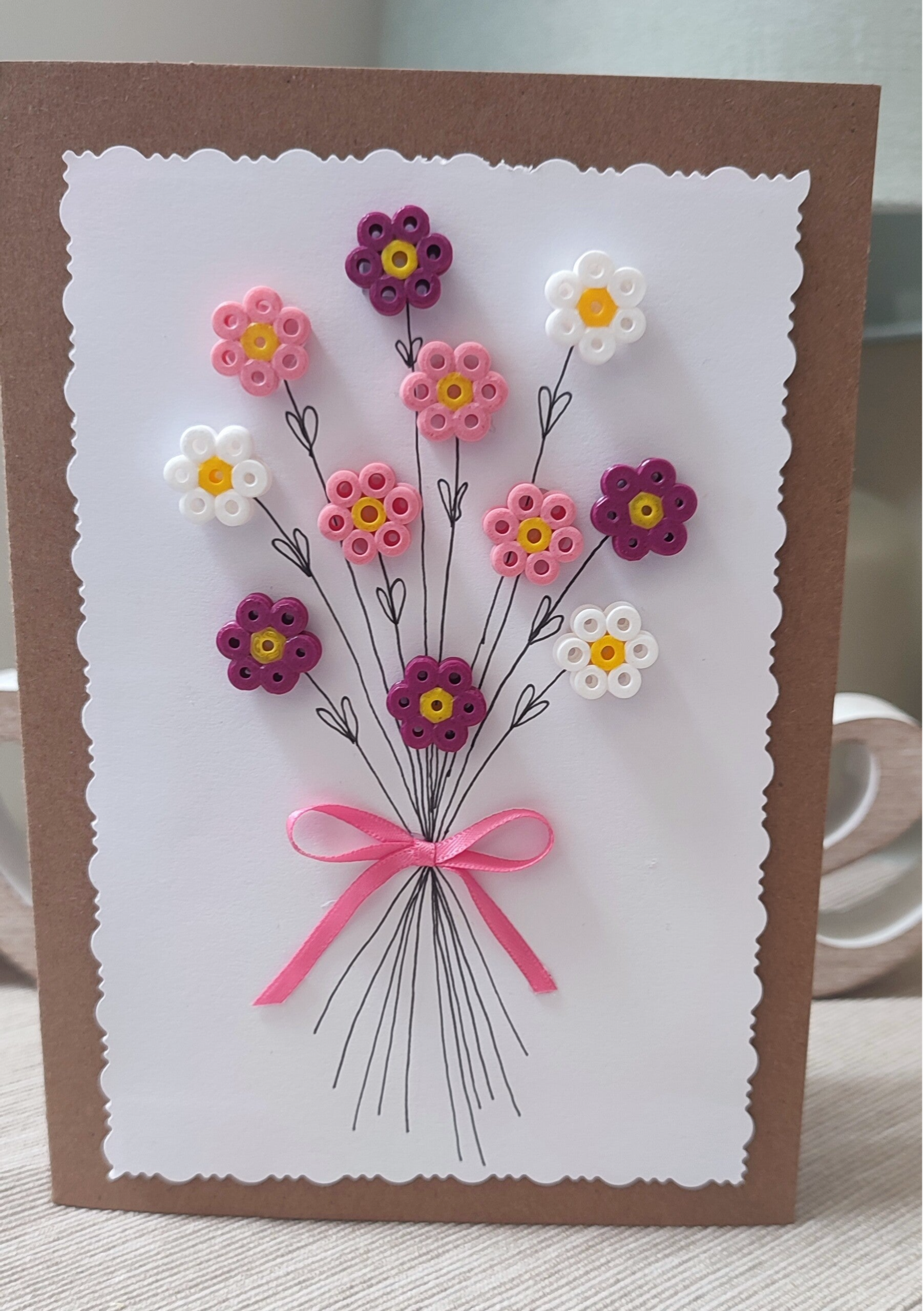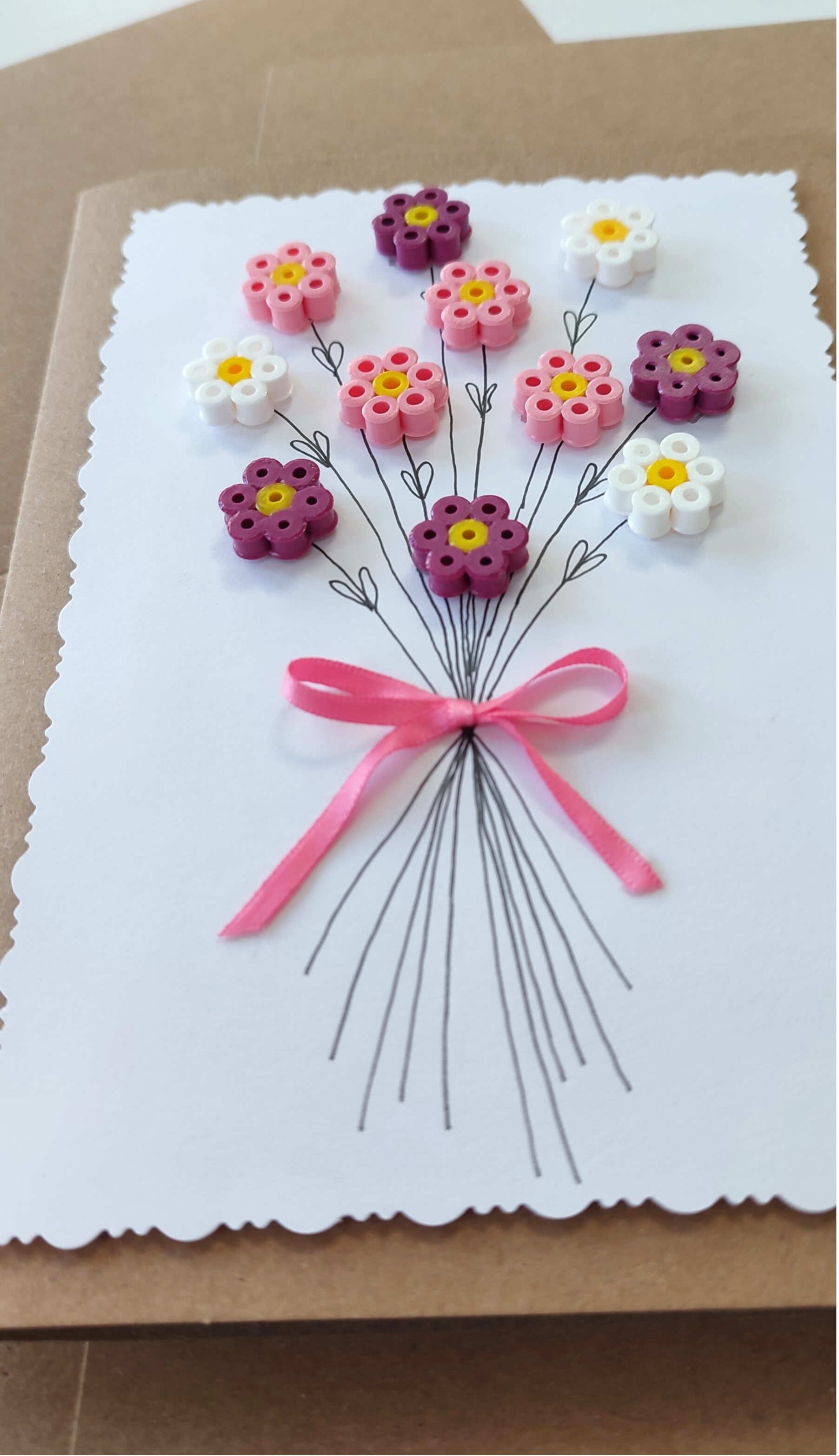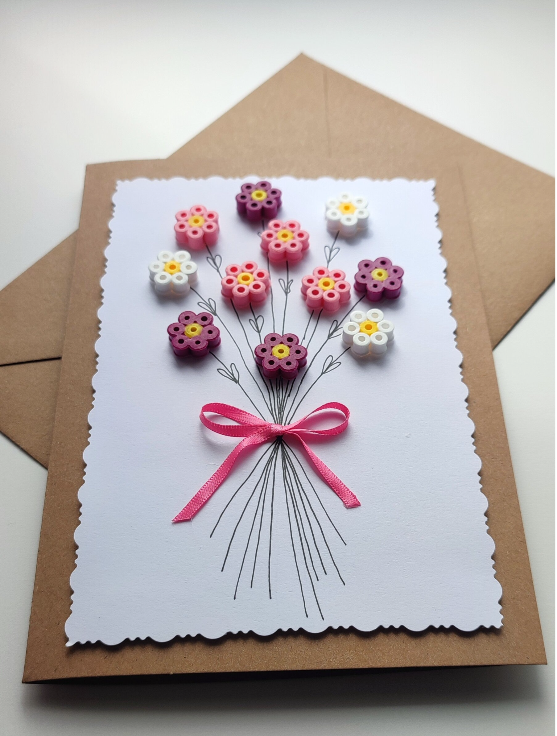 - beaded pink / white flowers bouquet detail, with little bow on a white card