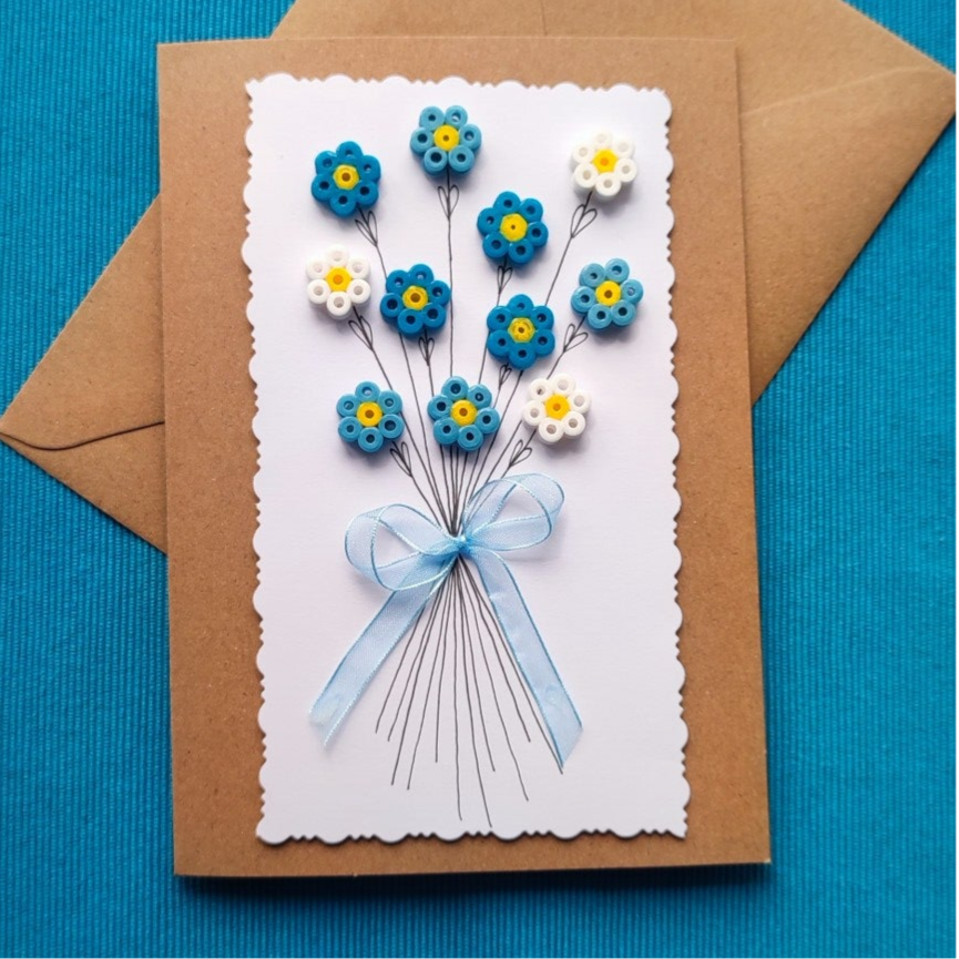 - beaded blue / white flowers bouquet detail, with little bow on a white card
