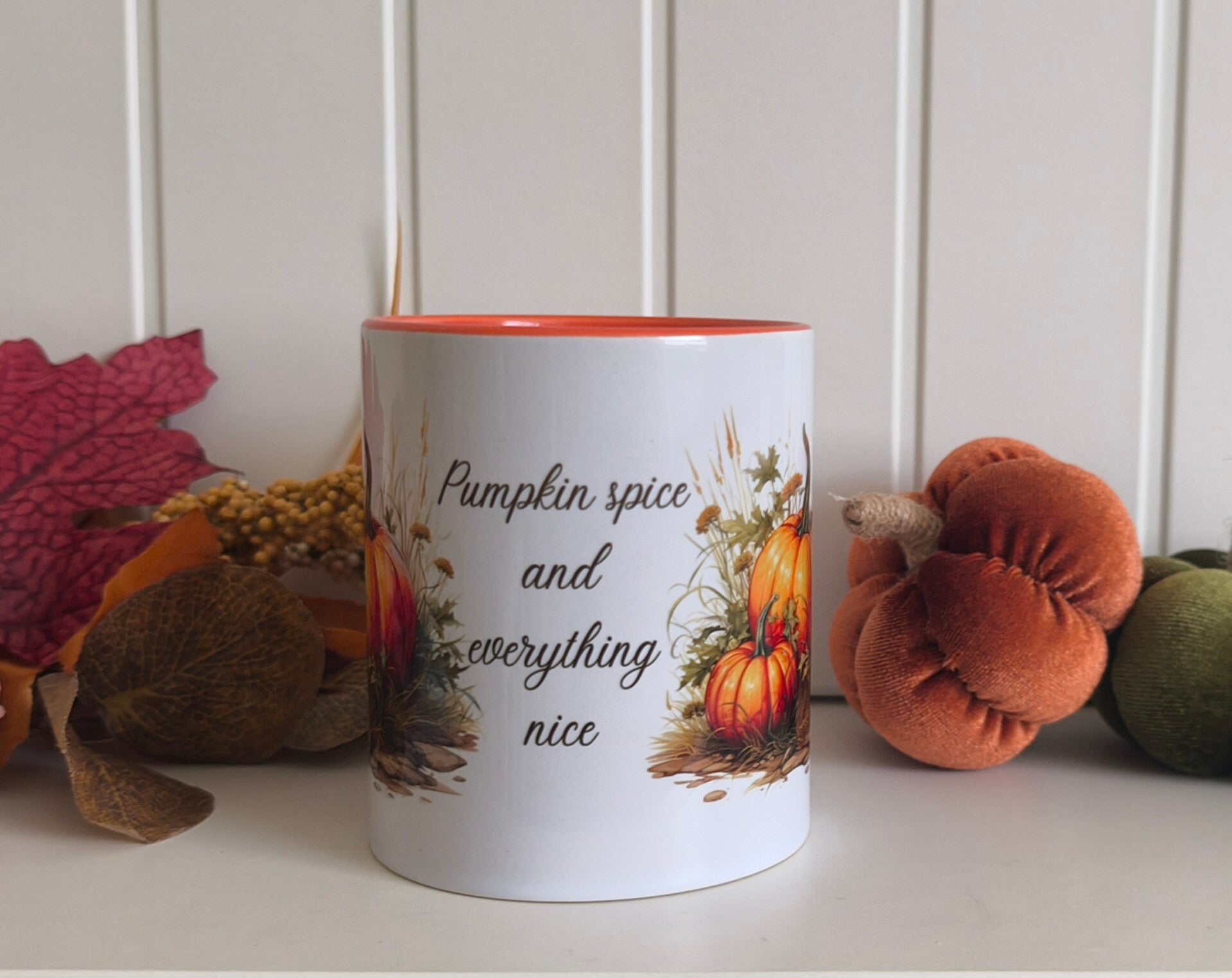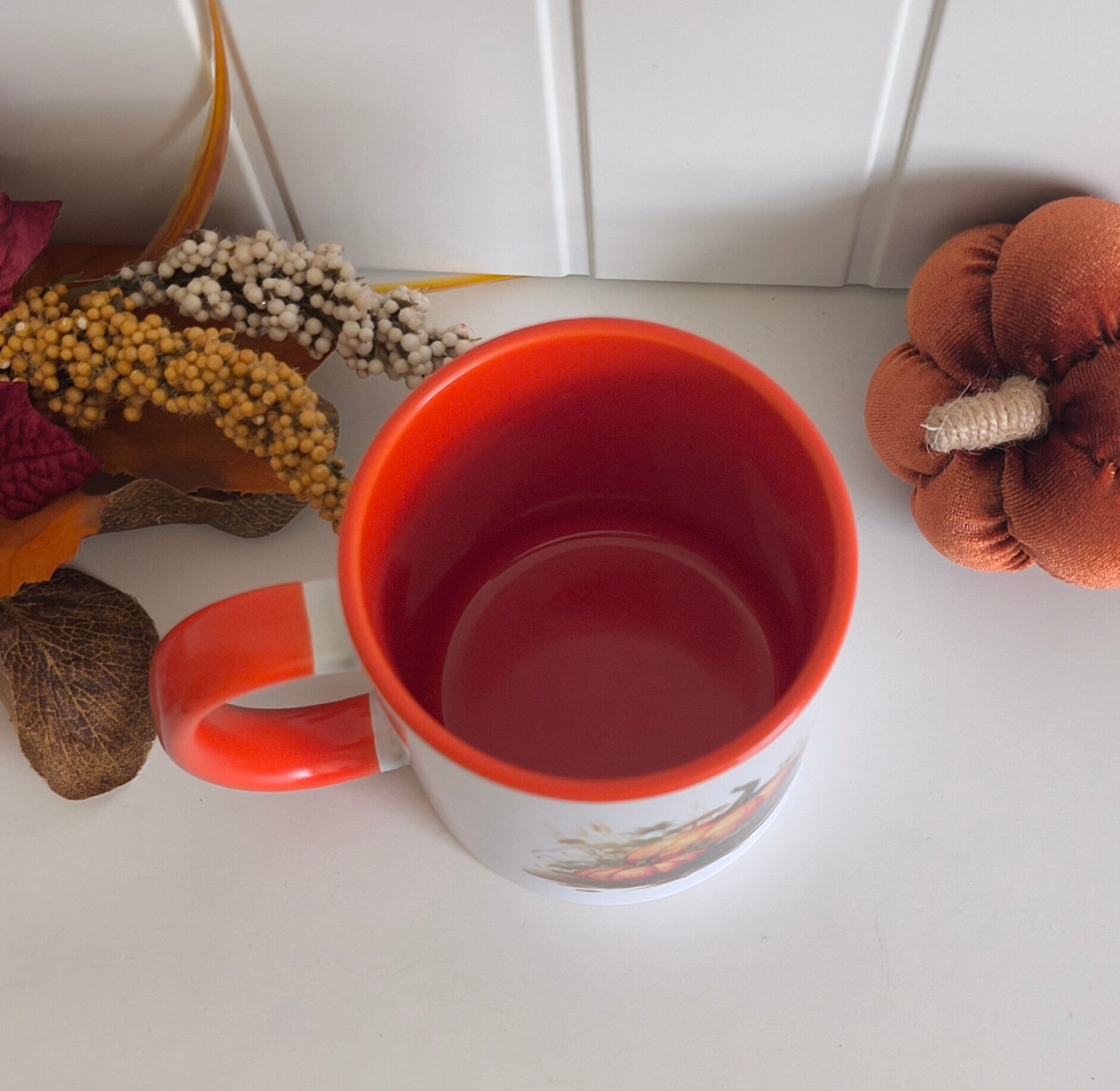 Bring a touch of autumn to your coffee or tea! This glossy white mug features a vibrant orange handle and inner, with a lovely pumpkin design. Perfect for cozy mornings, seasonal gifts, or adding a little fall charm to your kitchen.